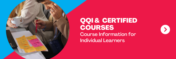 With a generous membership discount on our QQI & certified courses, individual learners can choose from a wide range of courses to suit their professional development needs. Our QQI and certified courses are available as online (self-paced) or remote (via zoom) classrooms, giving learners maximum flexibility. Click through to check out our course options and download any of our course brochures.