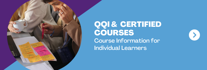How to Access QQI Courses: With a generous membership discount on our QQI & certified courses, individual learners can choose from a wide range of courses to suit their professional development needs. Our QQI and certified courses are available as online (self-paced) or remote (via zoom) classrooms, giving learners maximum flexibility. Click through to check out our course options and download any of our course brochures.