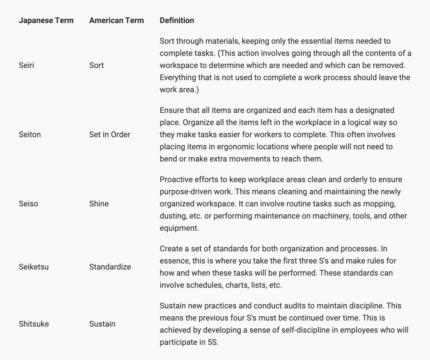 There are five pillars in 5S in a continuous improvement program, which stand for: Sort, Set in Order, Shine, Standardize, and Sustain — or in Japanese, Seiri, Seiton, Seiso, Seiketsu, and Shitsuke. The goal of a 5S program is to get products closer to operations and workers, organized and labelled, to eliminate wasted time and materials. The 5S philosophy is “a place for everything and everything in its place,” and helps to eliminate wasted time, wasted space, and wasted inventory. Implementing 5S raises product quality and improves work productivity, resulting in lower costs and higher efficiencies.